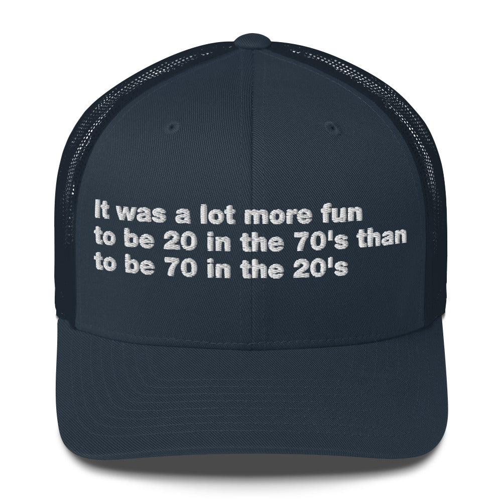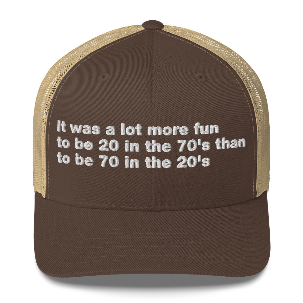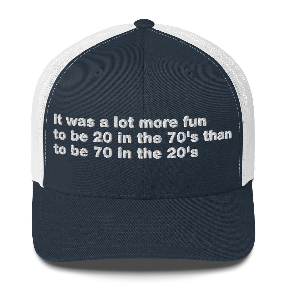 It was a lot more fun to be 20 in the 70's than to be 70 in the 20's - Trucker Cap