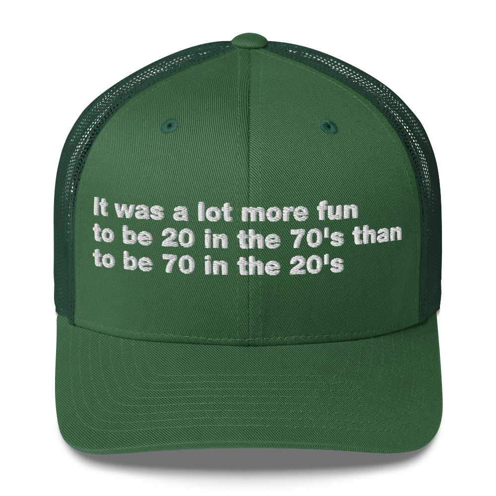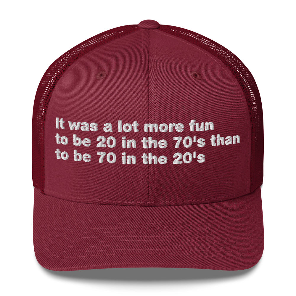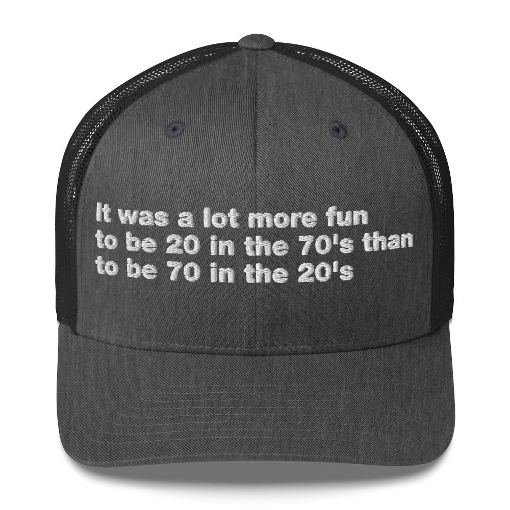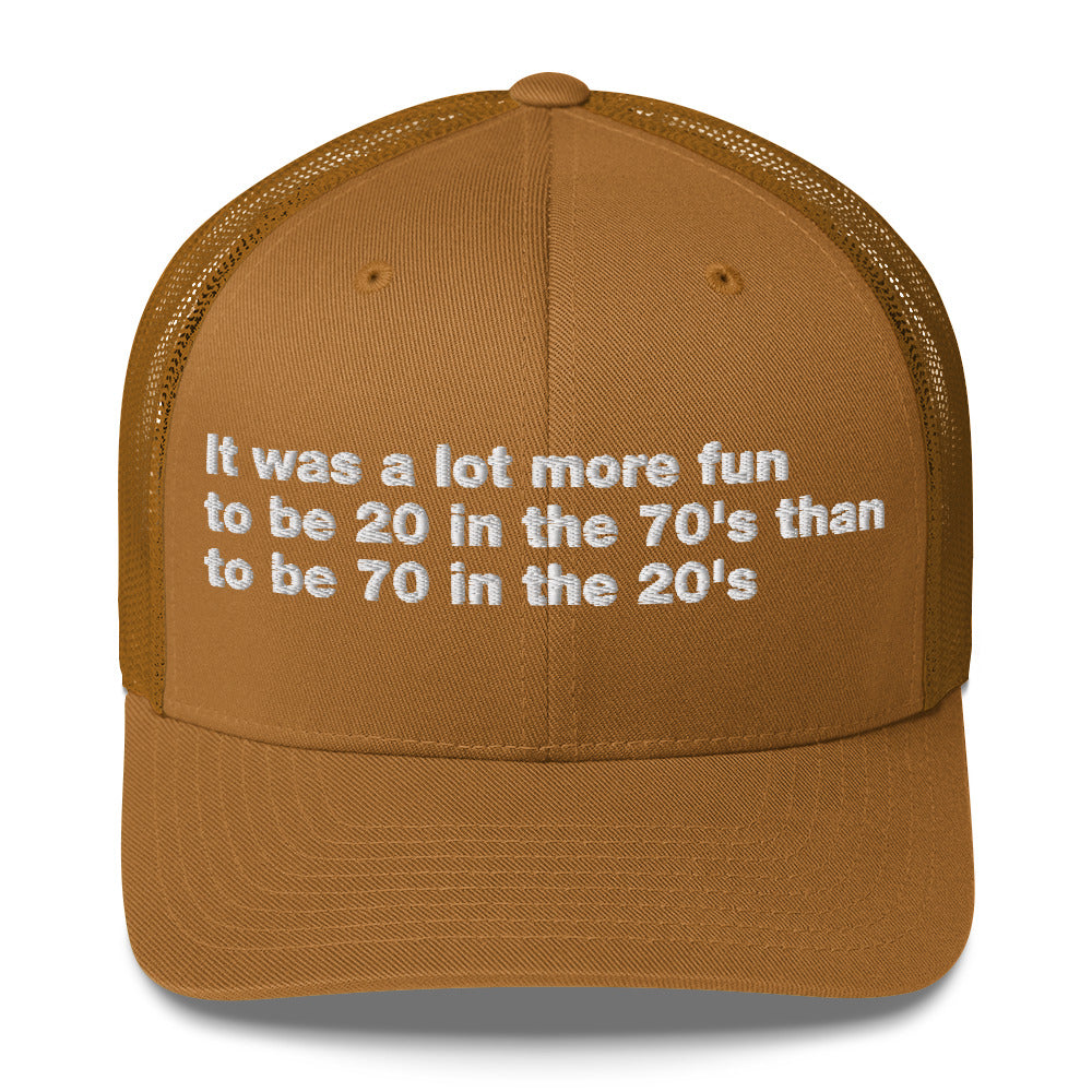 It was a lot more fun to be 20 in the 70's than to be 70 in the 20's - Trucker Cap